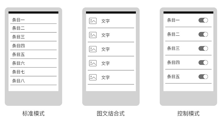 垂直式列表一般有三種展示模式,有標(biāo)準(zhǔn)模式,圖文模式以及控制模式。